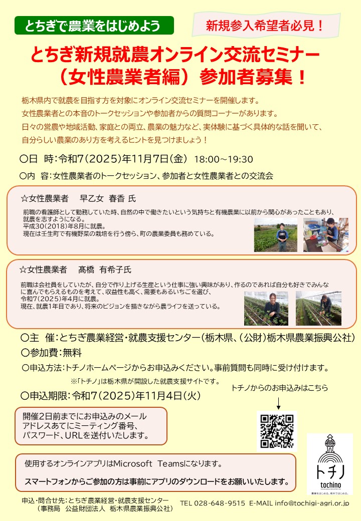 とちぎ新規就農オンライン交流セミナーチラシ(女性農業者編)